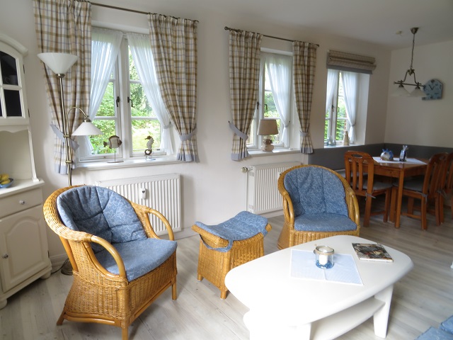 Wohnung Silke – Das lichtdurchflutete Wohnzimmer mit den gemütlichen Korbsesseln.